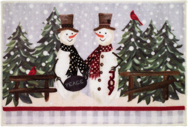 The Country Friends Printed Nylon Rug depicts 2 happy snowmen in their black and burgundy checked scarves with snowy pine trees in the background and cardinals perched on split-rail fencing and trees. The background is light grey with falling snowflakes. 20 x 30.