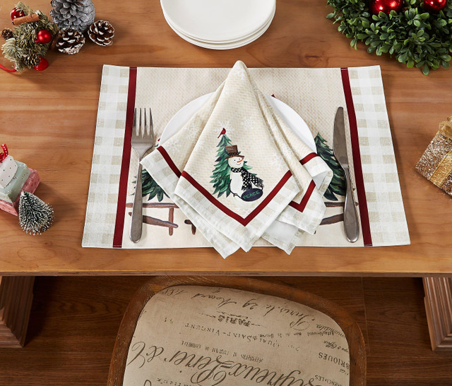 The Avanti Country Snowman Set of 4 Placemats features three holiday trees with stars on a textured off-white ground with grey highlights throughout. The trees stand above a linen border edged with pine branches. Printed on 100% polyester for easy care, brilliant color, 13 in. x 19 in.