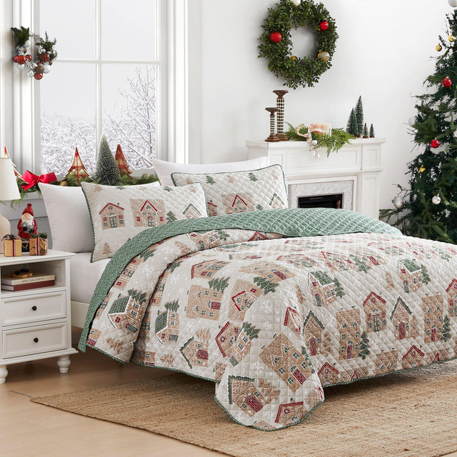 The Avanti Gingerbread Houses Quilt Set features a festive holiday scene with decorated houses, trees and snowflakes on a linen, quilted background. Reverses to a green rooftop design.100% polyester