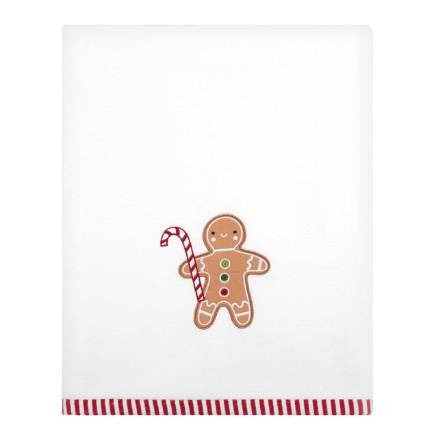 Add festive charm to your bathroom with the Avanti Gingerbread Man Embroidered Bath Towel. Featuring a sweet gingerbread man holding a candy cane on soft white velour, this 100% cotton towel is finished with a red and white striped border. Perfect for holiday decoratingfun, cozy, and cheerful. Matching hand and fingertip towels available. Measures 27 in. x 52 in. Part of the Gingerbread Man Collection.