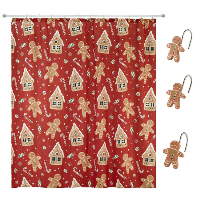Sweeten your holiday bathroom décor with the Avanti Gingerbread Man Shower Curtain and Hook Set. Featuring playful gingerbread men, candy, and houses on a red background, this 72 in. x 72 in. polyester curtain brings festive charm. Includes 12 hand-painted resin hooks shaped like gingerbread men. Perfect for Christmas bathroom décor, guest baths, or seasonal updates. Liner not included. Part of the Avanti Gingerbread Man Collection.