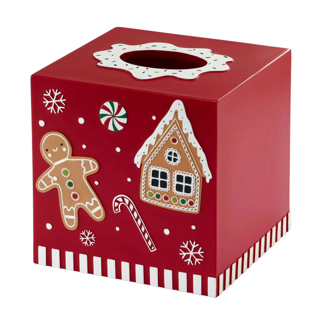 Add festive charm to your holiday décor with the Avanti Gingerbread Man Tissue Box Cover. Featuring a gingerbread man, candy, snowflakes, and a gingerbread house on a vibrant red ground, its finished with a candy cane stripe at the base. Made of durable hand-painted resin, its perfect for adding Christmas cheer to your bathroom, kitchen, bedroom, or office. Coordinating pieces available. Measures 6.00 in. x 5.75 in. x 5.75 in.