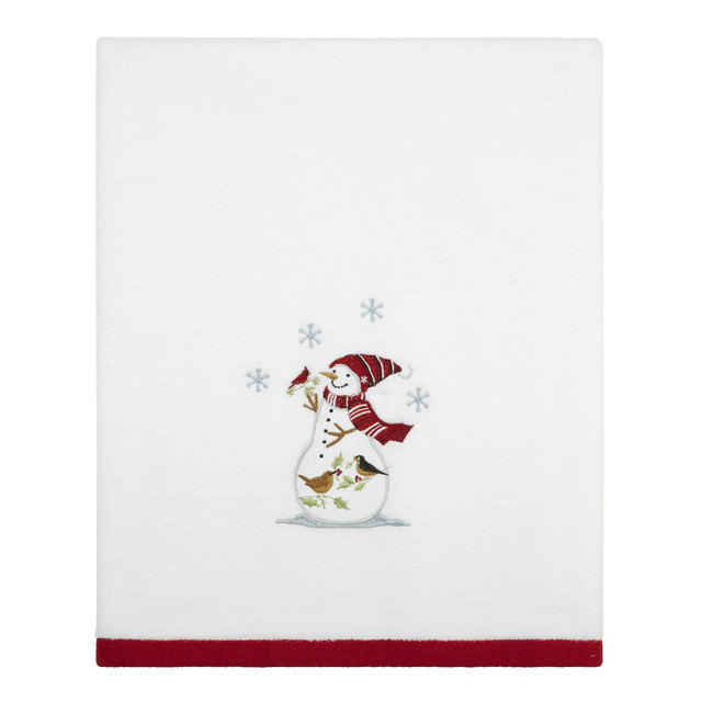 Celebrate the season with the Avanti Holiday Cheer Embroidered Bath Towel. Featuring a smiling snowman in a festive striped hat and scarf, surrounded by snowflakes and colorful birds, this soft velour towel adds warmth and joy to your holiday décor. Finished with a bold red border, its perfect for creating a cheerful bathroom look. Complete the set with coordinating accessories. Measures 27 in. x 52 in. Part of the Holiday Cheer Bath Towel Collection.