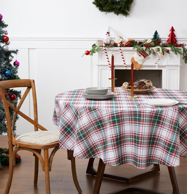 The Avanti Holiday Plaid 70 in. Round Tablecloth is a classic yarn-dyed woven red, green and white plaid design with gold lurex that adds a bit of holiday sparkle. Made of 55% cotton, 45% polyester yarns for soft feel and easy care. Makes your table the centerpiece of your holiday celebration.