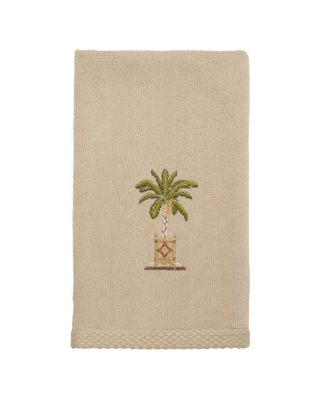 The Avanti Bali Decorative Embellished Towel Collection features an embroidered banana palm tree in a decorative planter, finished with coordinating color striped woven border.The velour linen bath towel measures approximately 27 x 50. The hand towel measures approximately 16 x 30. The fingertip towel measures approximately 11 x 18. Fabrication 95% cotton, 5% polyester.