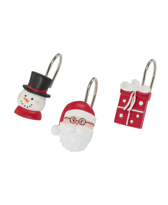 The Avanti Ho Ho Ho Decorative Shower Curtain Hook Set features 3 holiday icons-Santa, Snowman and gift box, coordinates with matching Ho Ho Ho shower curtain. Set includes 12 hooks-4 of each design. Made of durable, hand-painted resin with stainless hook for easy care, long life. Each hook measures approximtely 1.50 x 1.50 x 2.00.