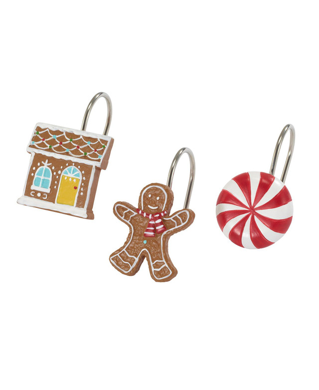 The Avanti Sweet Treat Decorative Shower Curtain Hook Set features 3 holiday icons-gingerbread house, gingerbread man and peppermint candy. Set includes 12 hooks-4 of each design. Made of durable, hand-painted resin with stainless hook for easy care, long life. Each hook measures approximtely 1.50 x 1.50 x 2.00.