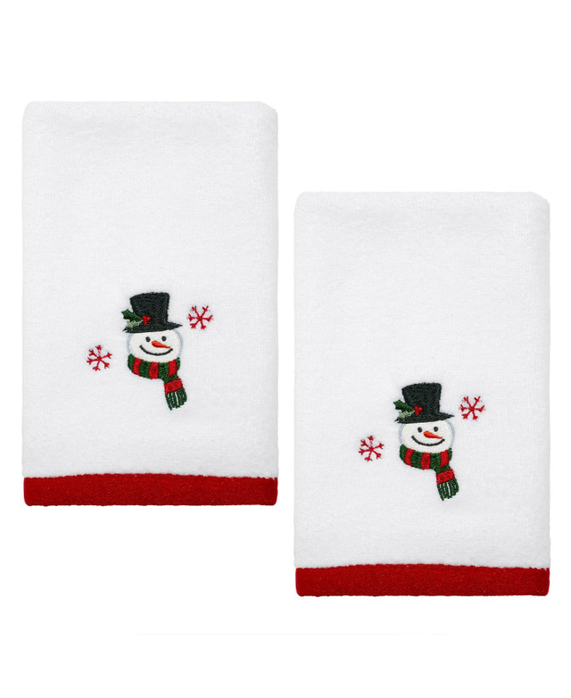 The Avanti Winter Snowman White Embroidered Decorative Fingertip Towel 2-Pack features a happy, smiling snowman with top hat green and white scarf. Red snowflakes finish the winter scene. Set includes two 11 x 18 100% cotton white velour towels with red polyester border.
