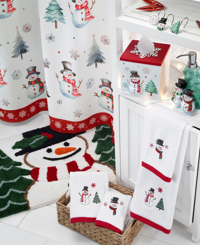 The Avanti Winter Snowman Decorative Shower Curtain features a series of happy, colorfully-scarved snowmen on a white ground. Snow-covered pine trees, snowflakes and stars, with a red snowflake border, fill-out the design. Fabrication 100% polyester. Measures 72 x 72. Imported.