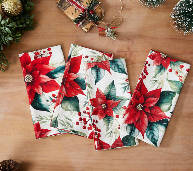 The Avanti Poinsettia Set of 4 Holiday Napkins features a classic poinsettia design in red and green on an ivory ground. Printed on 100% polyester for easy care and brilliant color reproduction and coordinates with tablecloths and placemats, 18 in. x 18 in. Give your table the perfect holiday makeover!!