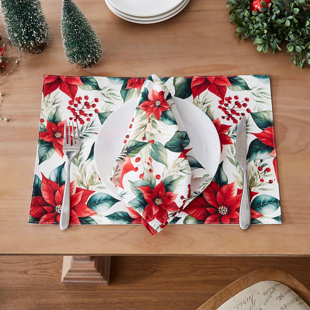 The Avanti Poinsettia Set of 4 Holiday Placemats features a classic poinsettia design in red and green on an ivory ground. Printed on 100% polyester for easy care and brilliant color reproduction, coordinates with tablecloths and napkins, 13 in. x 19 in. Give your table the perfect holiday makeover!!