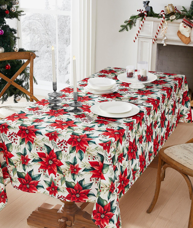 The Avanti Poinsettia 60 in. x 102 in. Holiday Tablecloth features a classic poinsettia design in red and green on an ivory ground. Printed on 100% polyester for easy care and brilliant color reproduction. Give your table the perfect holiday makeover!!