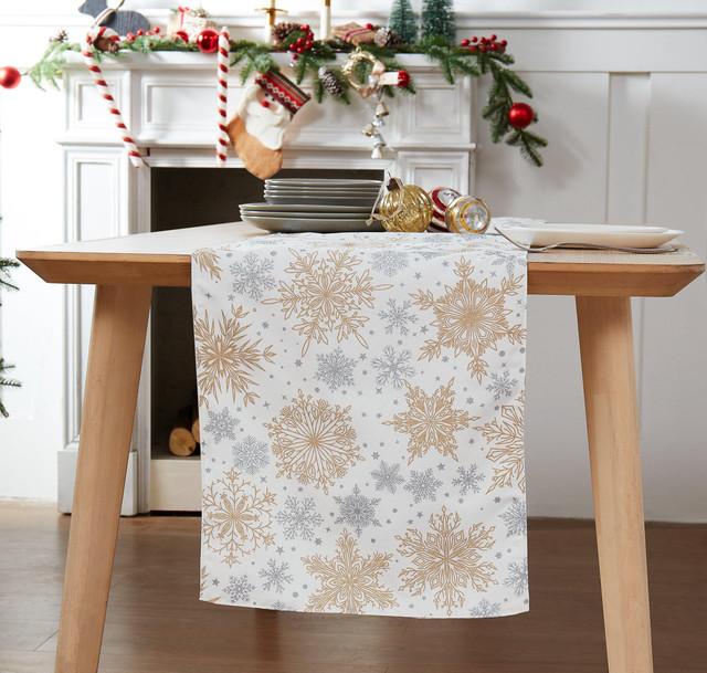 The Avanti Snowflakes 14 in. x 72 in. Holiday Runner features an allover design with large metallic gold snowflakes and smaller silver ones, along with stars and dots on a white ground. Printed on 100% polyester for easy care and brilliant color. Give your table the perfect holiday makeover!!