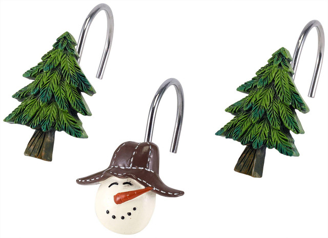 The Avanti Snowmen Gathering Shower Curtain Hooks features pine trees and the snowman's head detailed in hand-painted resin. Pack includes 12 hooks, 6 of each design. Measures: 7'' x 2.75'' x 3.75''.