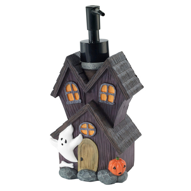The Avanti Spooky House Pump Dispenser features a brown spooky house decorated with a ghost, pumpkin and matching black pump. Brings the Halloween spirit to any room. Measures 4W x 4L x 8.1H.