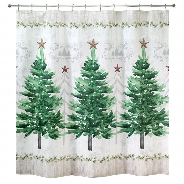 The Avanti Trees Shower Curtain features 3 large green Christmas trees with gold stars on an off-white ground with grey trees in the background. Linen bands top and bottom are bordered with pine branches.