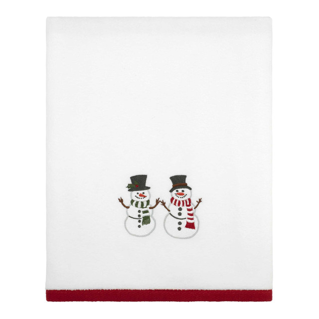 Celebrate the holidays with the Avanti Winter Snowman Embroidered Bath Towel. Featuring two cheerful snowmen in striped scarves and top hats on soft velour, this festive towel adds fun and warmth to your seasonal décor. Finished with a bold red border, its perfect for creating a joyful bathroom look. Hand towel 2-pack, fingertip 2-pack, and matching accessories available. Measures 27 in. x 50 in. Part of the Winter Snowman Bath Towel Collection.