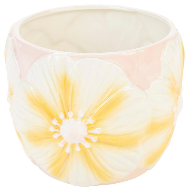 Enhance your botanical display with the 6.5 in Yellow Floral Ceramic Planter featuring embossed tropical flowers inspired by vibrant hibiscus blooms. A striking decorative accent for indoor or outdoor settings, ideal for medium sized plants. Fabrication is 100% ceramic. Measures approximately 6.5 in x 7 in round.