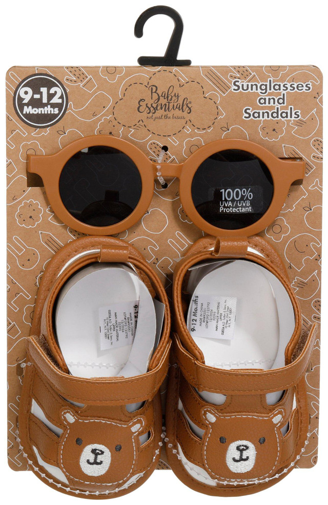This adorable 2-piece baby sandals set includes velcro-strap sandals with a sweet embroidered bear face and matching sunglasses offering 100% UVA/UVB protection. Perfect for sunny day adventures in style and comfort!