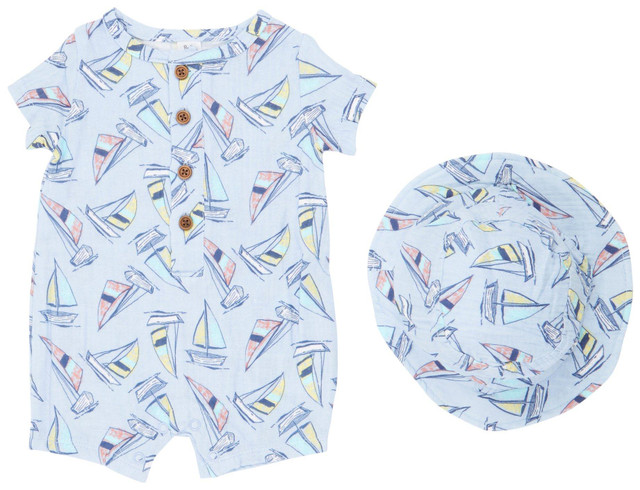 This baby boys' 2-piece romper set features a short sleeve romper with an all-over sailboat print and a classic Henley neckline, paired with a matching hat. Soft and breezy, it is a charming outfit for sunny days and seaside fun.