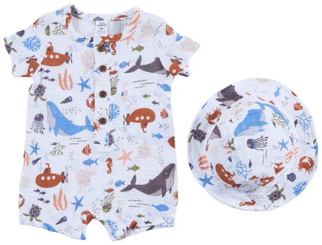 Dive into adorable style with this baby romper and hat set featuring a playful ocean-themed print! With short sleeves, easy front button closures, and a matching bucket hat, this comfy cotton outfit is perfect for warm-weather adventures. Designed for both cuteness and convenience!