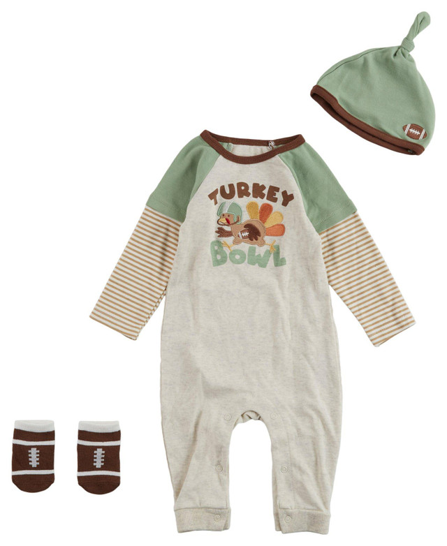 Celebrate fall moments with the Baby Boy 3 Pc Turkey Bowl Coverall Hat Set. Features a long sleeve coverall with snap closures for easy diaper changes and an embroidered turkey wearing a football helmet labeled Turkey Bowl. Includes a matching hat and socks designed to look like tiny footballs. Ideal for seasonal photos and cozy gatherings. Machine washable for easy care. Fabrication is 60% cotton, 40% polyester.