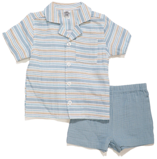 Breezy style meets all-day comfort in this striped 2-piece set, featuring a soft cotton gauze short-sleeve button-up shirt and matching elastic waist shorts. Lightweight and breathable, its perfect for sunny adventures or laid-back lounging. The relaxed fit and playful stripes add a fresh twist to warm-weather dressing, making it a go-to outfit for effortless summer charm.