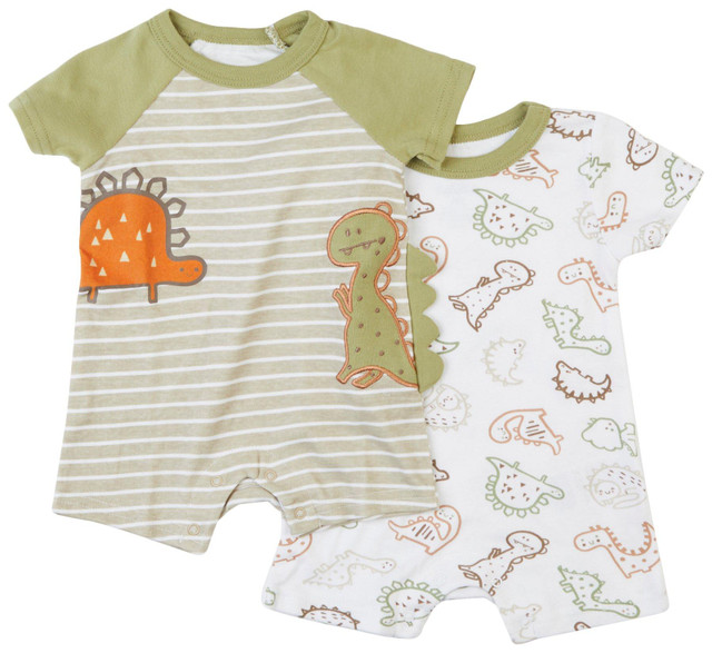Add playful variety to his wardrobe with this Baby Boys 2 Pc Dinosaur Rompers Set, featuring one striped romper with dinosaur accents and one with an allover dinosaur print. Made from a soft cotton/poly blend for comfort and ease. Ideal for daily wear, playtime, and warm-weather outings. Fabrication is 60% cotton, 40% polyester.