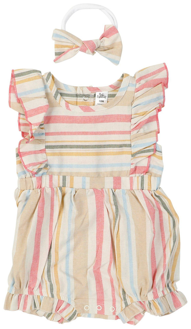 Sunny days call for sweet style! This 2-piece set features a striped sleeveless romper with a comfy fit and playful charm, paired with a matching headband for the perfect finishing touch. Soft, breathable fabric keeps your little one cool and cozy, making it a go-to outfit for warm-weather adventures.