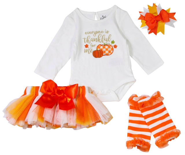 This 4 piece set includes a bodysuit with the message Everyone is thankful for me, a headband, a mesh tutu, and leg warmers. The bodysuit is 60% cotton and 40% polyester. The tutu is 100% polyester. The leg warmers are 62% polyester, 36% cotton, and 2% spandex with 95% polyester and 5% rubber trim. Wash before wearing. Follow care instructions on each piece for best results.