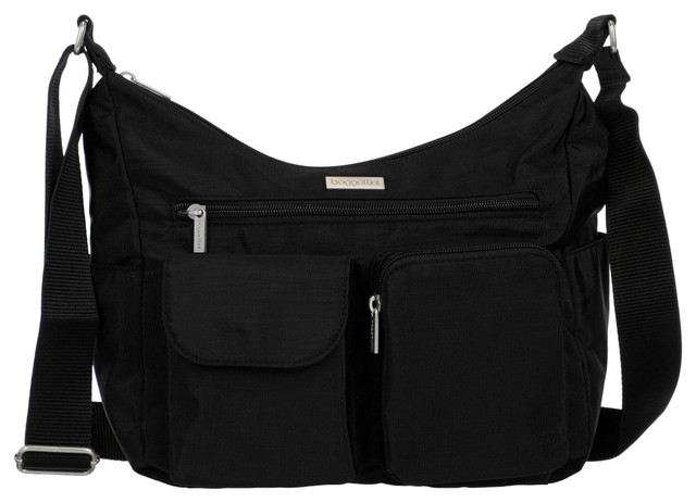 This medium hobo bag keeps essentials organized with single top zip, front magnetic and zipper pockets. Inside slots hold credit cards, a coin pocket, and a pen. Adjustable straps offer comfortable wear. Stylish and practical, it makes every outing easier and adds a touch of confidence to your day. Measures approximately 10 in x 9 in x 2 in.