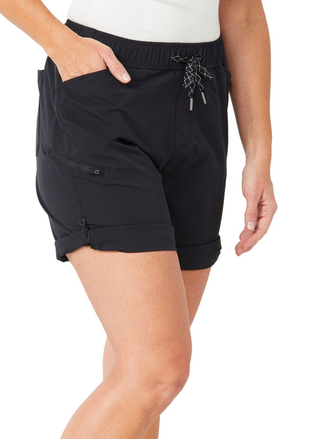 Step out in style with these womens active shorts featuring a structured fit and durable woven fabric. Designed to be cuffed and secured they offer versatile wear for any activity. Front and rear pockets provide practical storage while the tailored look adds a polished touch to your active wardrobe. Fabrication is 100% polyester.