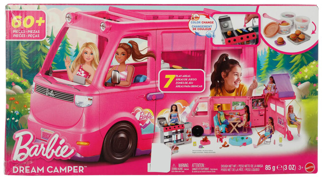 This Barbie Dream Camper playset unfolds into endless adventures, featuring 7 play areas including a tent, living room, and dining space. With over 60 accessories and a fun color-changing cooking feature, it inspires hours of imaginative play and outdoor fun. Dolls not included.