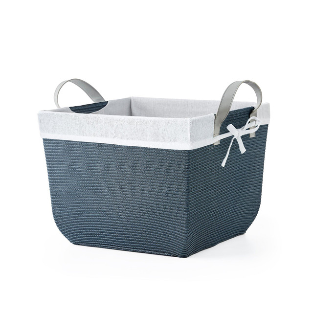 Elevate your home decor with our exquisite faux wicker basket, meticulously crafted to blend functionality with aesthetic appeal. This basket features a sturdy construction with a tailored white cloth lining, perfect for adding a touch of elegance to any room. The rich brown faux leather handles ensure easy transport, while the adorable bow tied at the front adds a quaint charm. Large faux wicker bin measures 15.5''x15.5''x12. 100% linen liner is removable and washable. Holds up to 50 lbs.