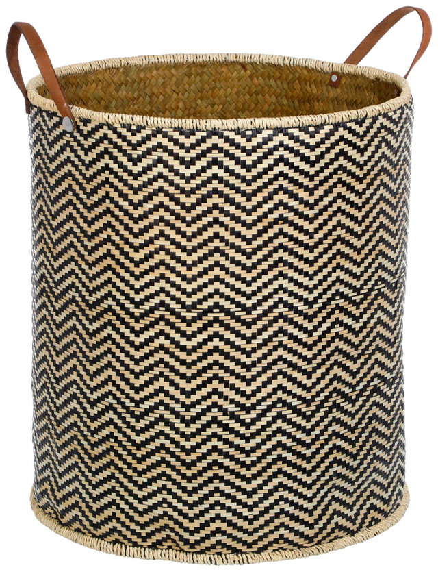 This round woven palm leaf basket showcases a detailed pattern that adds texture and depth to its natural charm. Designed with sleek faux leather handles, it blends rustic craftsmanship with modern flair. Ideal for organizing or decorating, this basket brings effortless style and function to any space. Measures approximately 17 in x 19.5 in. and 23 in. with handles.