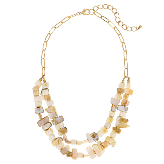Elevate your style with this layered necklace featuring natural-toned beads in creamy ivory and soft gold hues. Paired with a chunky gold-tone chain, its a perfect neutral statement piece for everyday elegance or vacation-ready vibes.