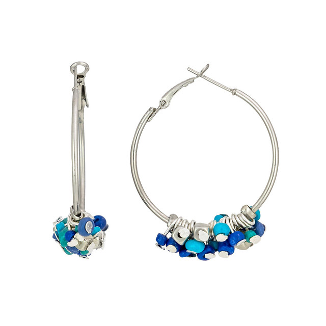 Add a splash of color with these silver-tone hoop earrings, accented with vibrant turquoise and cobalt blue beads. Lightweight and fun, theyre the perfect pop for beach days, festivals, or everyday wear.