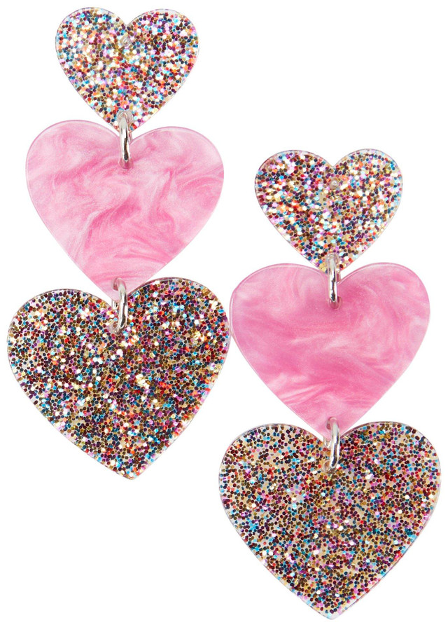 Add playful sparkle to your look with the Glitter Heart Trio Earrings featuring a triple drop design with multicolored glitter on the top and bottom hearts and a pink heart in the center. Silver tone post back and connectors provide secure wear. Ideal for festive outfits or fun everyday style. Suitable for pierced ears.