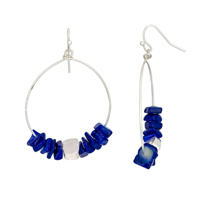 Make a bold statement with these stunning cobalt blue and silver hoop earrings. Designed with vibrant blue stone chips and a sleek silver-tone centerpiece bead, these earrings bring a pop of color and modern elegance. The open teardrop hoop shape adds a lightweight, airy feel perfect for both casual outfits and polished ensembles.