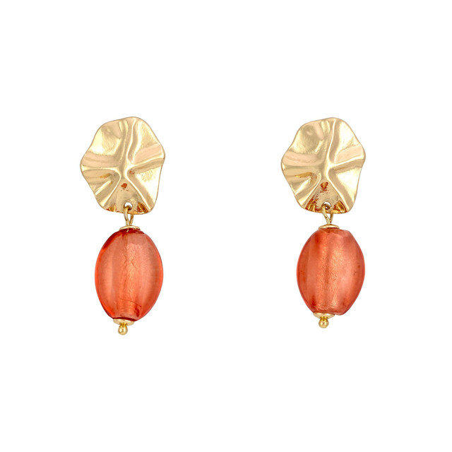 These stylish earrings feature a textured, gold-tone ripple top paired with a translucent coral-colored oval bead drop. The combination of organic shapes and warm hues gives them a summery, artisan feelperfect for casual chic or vacation wear.