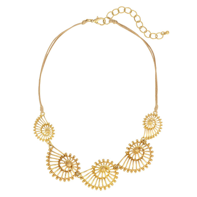 Add a touch of coastal elegance with the Beach Chic Gold Tone Shell Necklace. Featuring a delicate double rope necklace adorned with five flat filigree shell shapes that gradually increase in size toward the center, each shell is joined by polished gold connectors for a fluid look. Ideal for resort wear or summer evenings. Fabrication is gold tone metal. Measures approximately 16 in with 2 in extender.