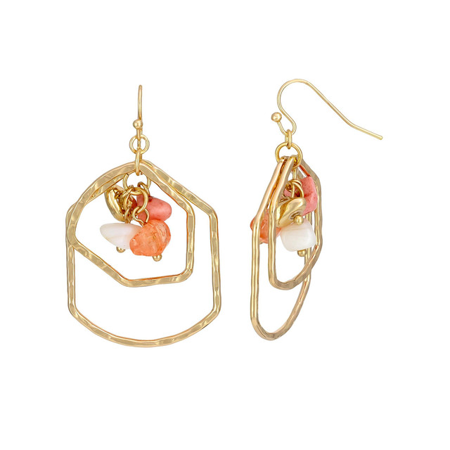 Stand out with these gold-tone geometric dangle earrings featuring open hammered shapes and clustered coral and white bead charms. A playful mix of modern design and boho flairperfect for summer styling.