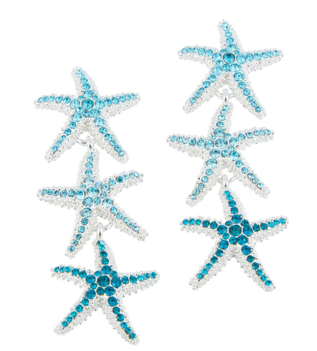 The Beach Chic Triple Starfish Rhinestone Dangle Earrings feature three shimmering starfish charms adorned with rhinestones, creating a sparkling, coastal-inspired look. These elegant earrings add a touch of beachy glamour to any outfit, perfect for summer or vacation style.