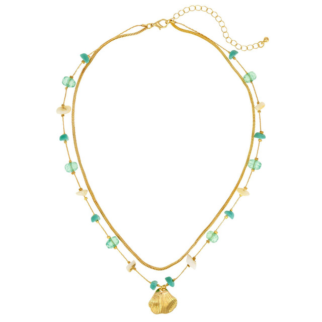 This elegant double-layered gold-tone necklace features aqua and pearl-like beaded accents on the upper strand, complemented by a lower strand showcasing a metallic gold shell pendant. The adjustable chain and beachy color palette make it a breezy, ocean-inspired accessory for warm-weather looks.