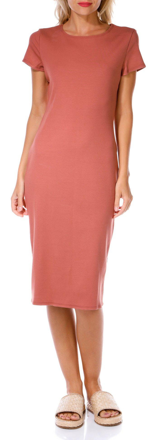 Keep it effortlessly cool in this Juniors Ribbed Midi T-Shirt Dress. Featuring short sleeves, a classic crew neckline, and a flattering midi length, its solid ribbed fabric adds texture and style. Perfect for casual days or dressed-up nights with the right accessories. Fabrication 90% polyester, 10% elastane