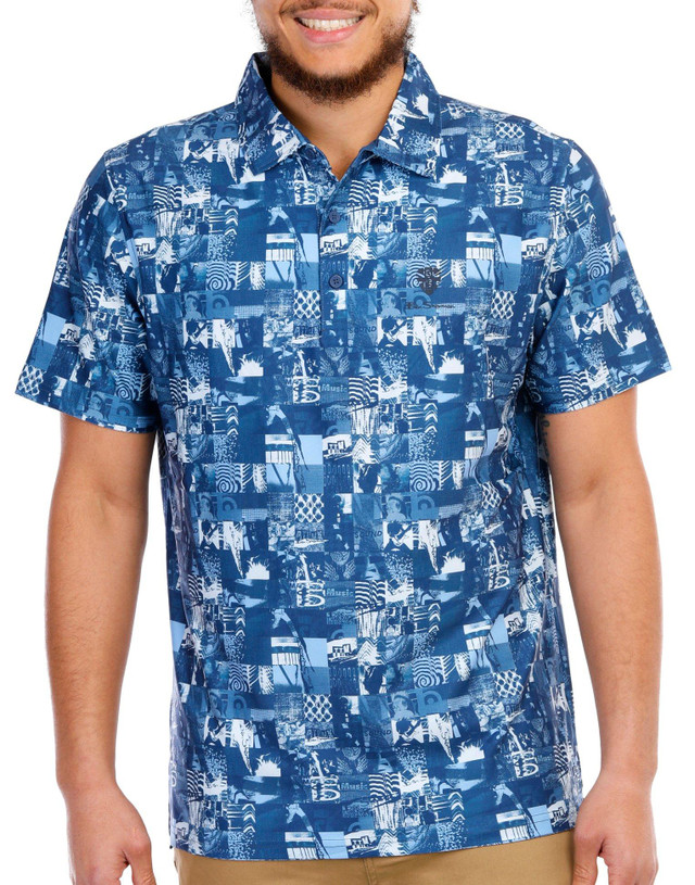 Look your very best, whether out on the course or around town, in this super stylish short sleeve sport polo. It features an eye-catching collage print pattern design, collared polo style neckline, and super soft breathable fabric. Fabrication is 88% polyester, and 12% spandex.