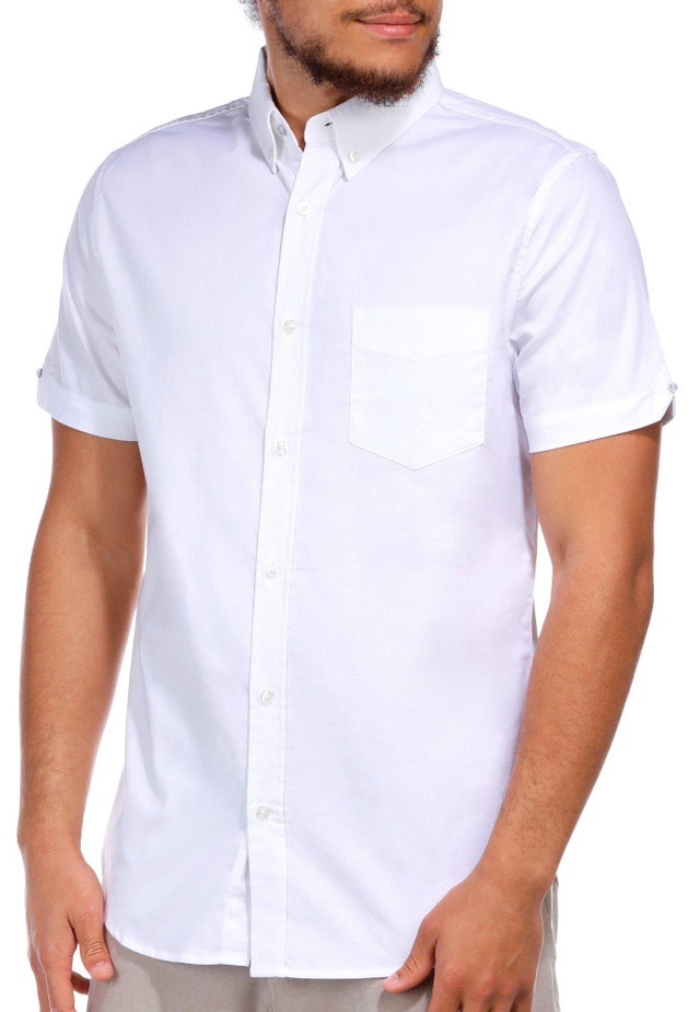 Introducing our Men's Solid Oxford Button Down Shirt, crafted from a blend of cotton and spandex for a comfortable and flexible fit. This stylish shirt features a solid color, short sleeves, a button-down front, a collared neckline, and a convenient chest slip pocket. Perfect for both casual and semi-formal occasions, this shirt is a versatile addition to any wardrobe.