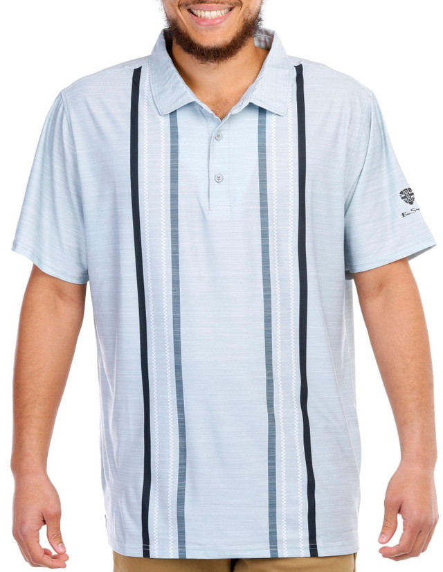 Look your very best, whether out on the course or around town, in this super stylish short sleeve sport polo. It features an eye-catching vertical stripe print pattern design, collared polo style neckline, and super soft breathable fabric. Fabrication is 88% polyester, and 12% spandex.