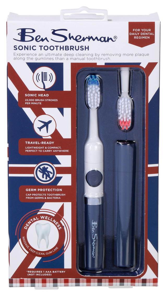 Keep your smile fresh on the go with the Ben Sherman Sonic Toothbrush. Travel-ready and equipped with a sonic brush head, it delivers powerful cleaning action. Includes a protective cap for germ-free storage and convenience wherever you go.
