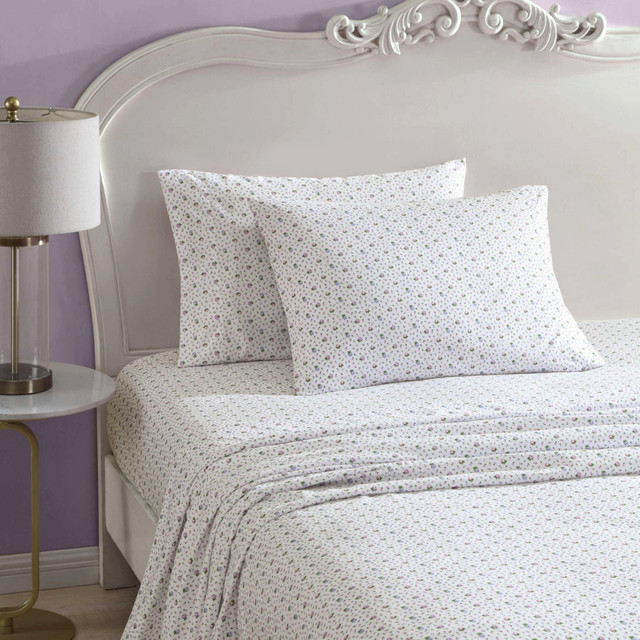 Brighten your bedroom with the Betsey Johnson Pretty Floral Ditsy Sheet Set. Made from ultra-soft, lightweight microfiber, these sheets are fade, stain, and wrinkle resistant for easy care. Featuring fun, feminine prints, from florals to skulls and stripes, they bring Betseys bold, playful style to your space. Pair with a Betsey Johnson comforter for the full look. Machine washable for easy care.